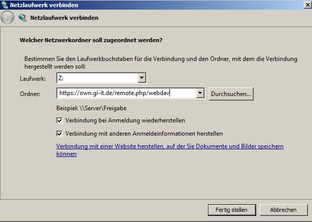 - Geben Sie bei „Ordner“ die WebDAV-URL ein. Diese lautet in der Regel: https://own.gi-it.de/remote.php/webdav/